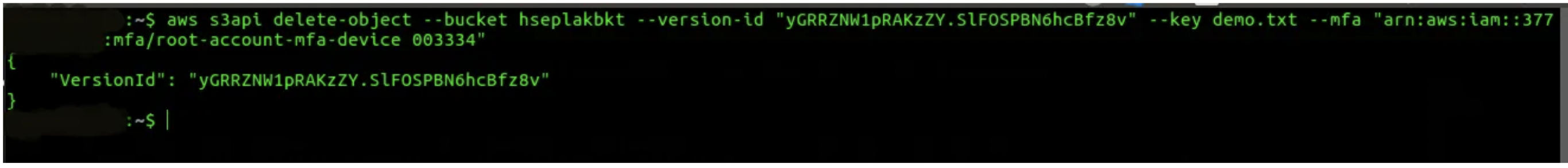 5. To test this feature, try to delete an S3 object version with and without the MFA token. The below command returns each version ID of the selected object.