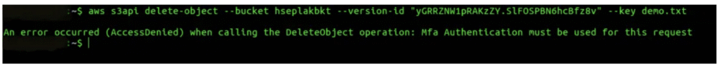 6. Try to delete the selected S3 object version without MFA authentication.
