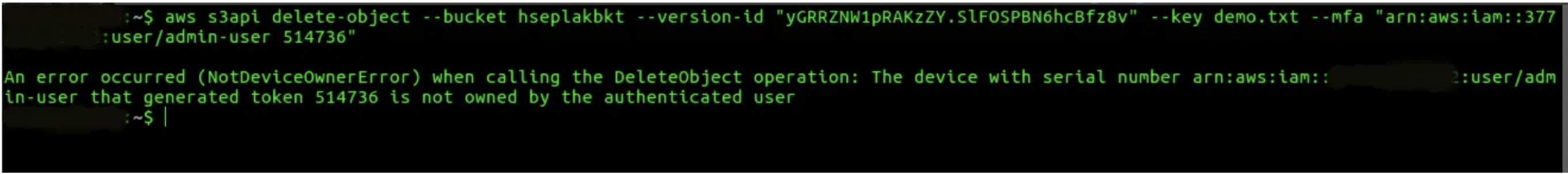 7. Try to delete the selected S3 object version with MFA authentication, but with other IAM user.