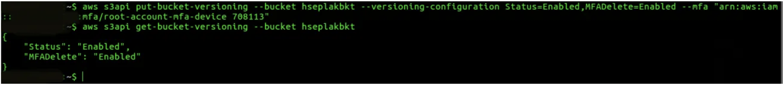 aws s3api put-bucket-versioning --bucket hseplakbkt - - versioning-configuration Status=Suspended,MFADelete=Disabled --mfa “arn:aws:iam::aws_account_id:mfa/root-account-mfa-device passcode”