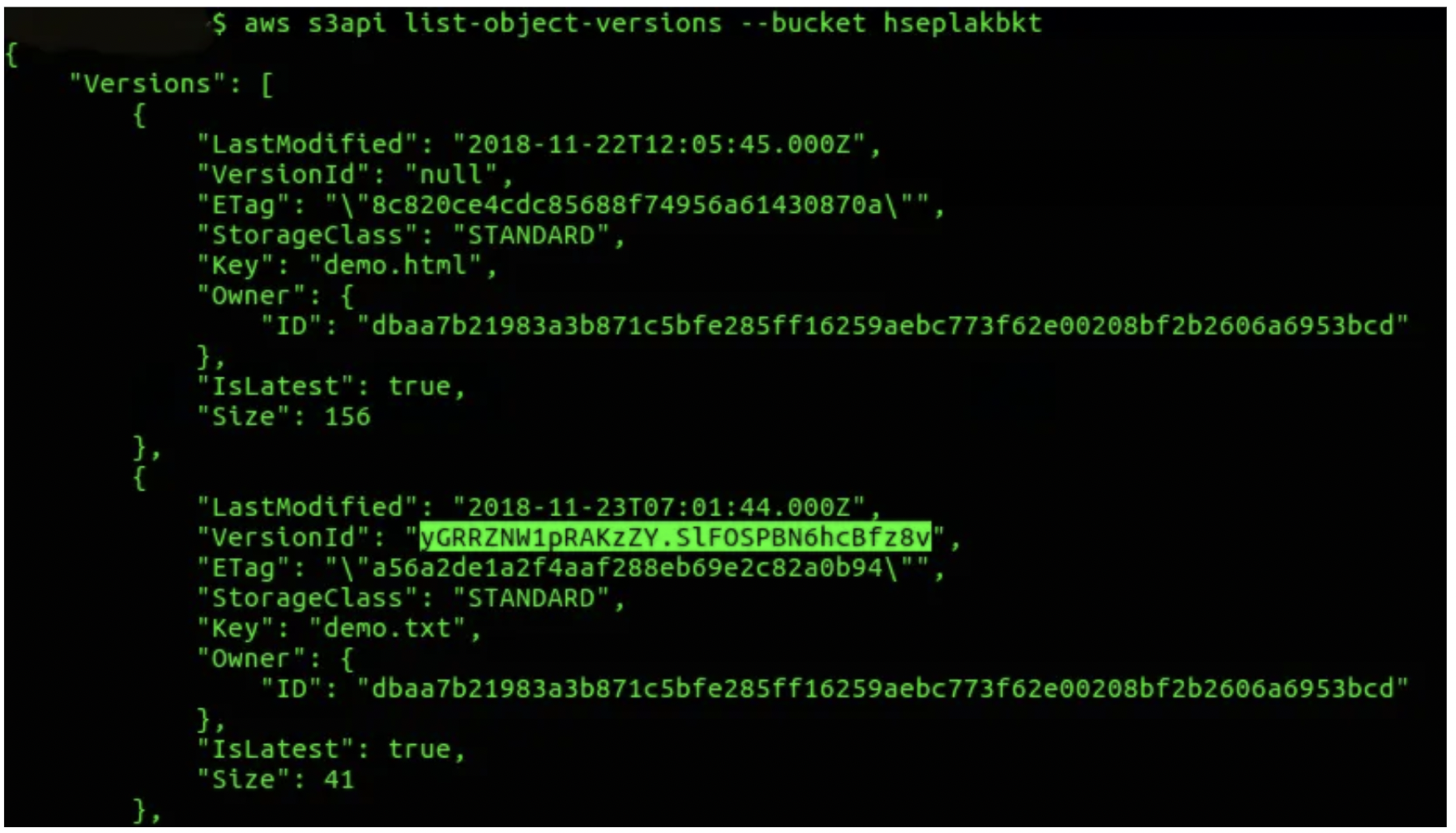 NOTE: If you want to see versioning for specific objects, use – – key parameter.
